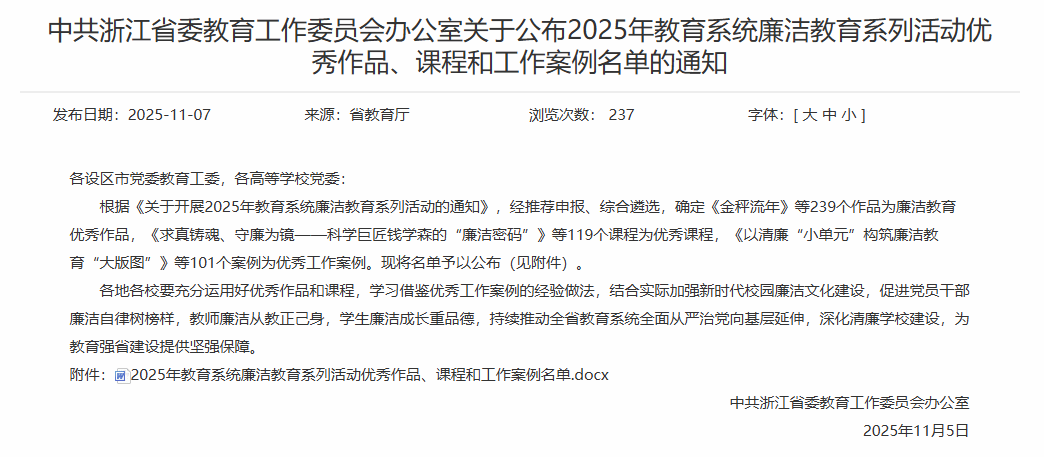 校园新闻网讯 近日,浙江省委教育工委公布2025年教育系统廉洁教育系列活动优秀作品、课程和工作案例名单。我校选送的4件作品荣获奖项,其中2件作品被推荐至教育部参评,创历史最好成绩。